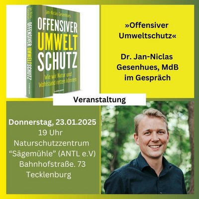 Erleben Sie Jan-Niclas Gesenhues live, wenn er am 23. Januar um 19 Uhr im Naturschutzzentrum „Sägemühle“ (ANTL e.V), Bahnhofstr. 73, 49545 Tecklenburg aus seinem Buch liest und gemeinsam mit Ihnen über Fragen diskutiert, die uns alle angehen: Wie bringen wir Umweltschutz mit Tatkraft und Innovation voran? Wie holen wir Naturschutz in die Mitte der Gesellschaft?